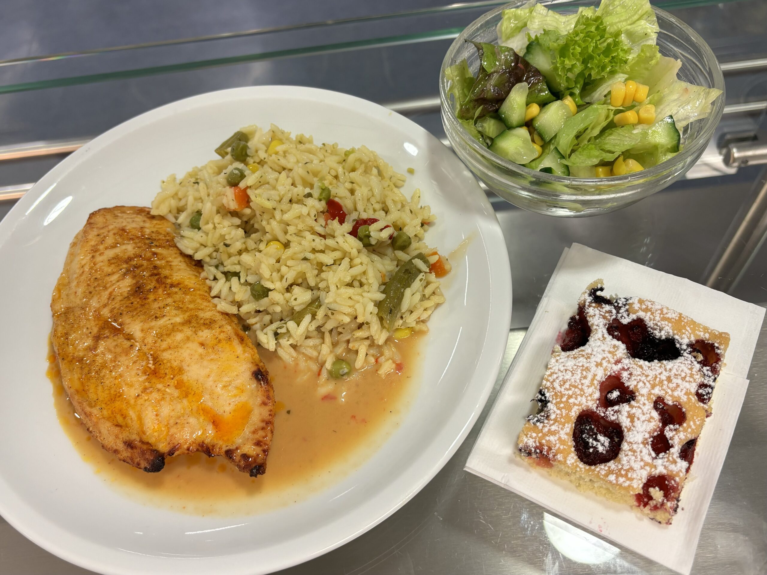 Der Einsatz in der Küche in Teamarbeit mit anderen Eltern macht allerdings auch großen Spaß – 75 Gurken zu Salat zu verarbeiten oder aus 24 Kilo Putenbrust und 12 Kilo Champignons Putengeschnetzeltes zu fabrizieren … Kochen in einer Großküche mit riesigen Mengen und Geräten ist für alle Neuen eine spannende Erfahrung. Und beim Muffins dekorieren oder Salat anrichten ist nebenher meist Zeit zum Schwätzen … So hält man sich beim Kochen mühelos nebenher über den Schulalltag auf dem Laufenden.